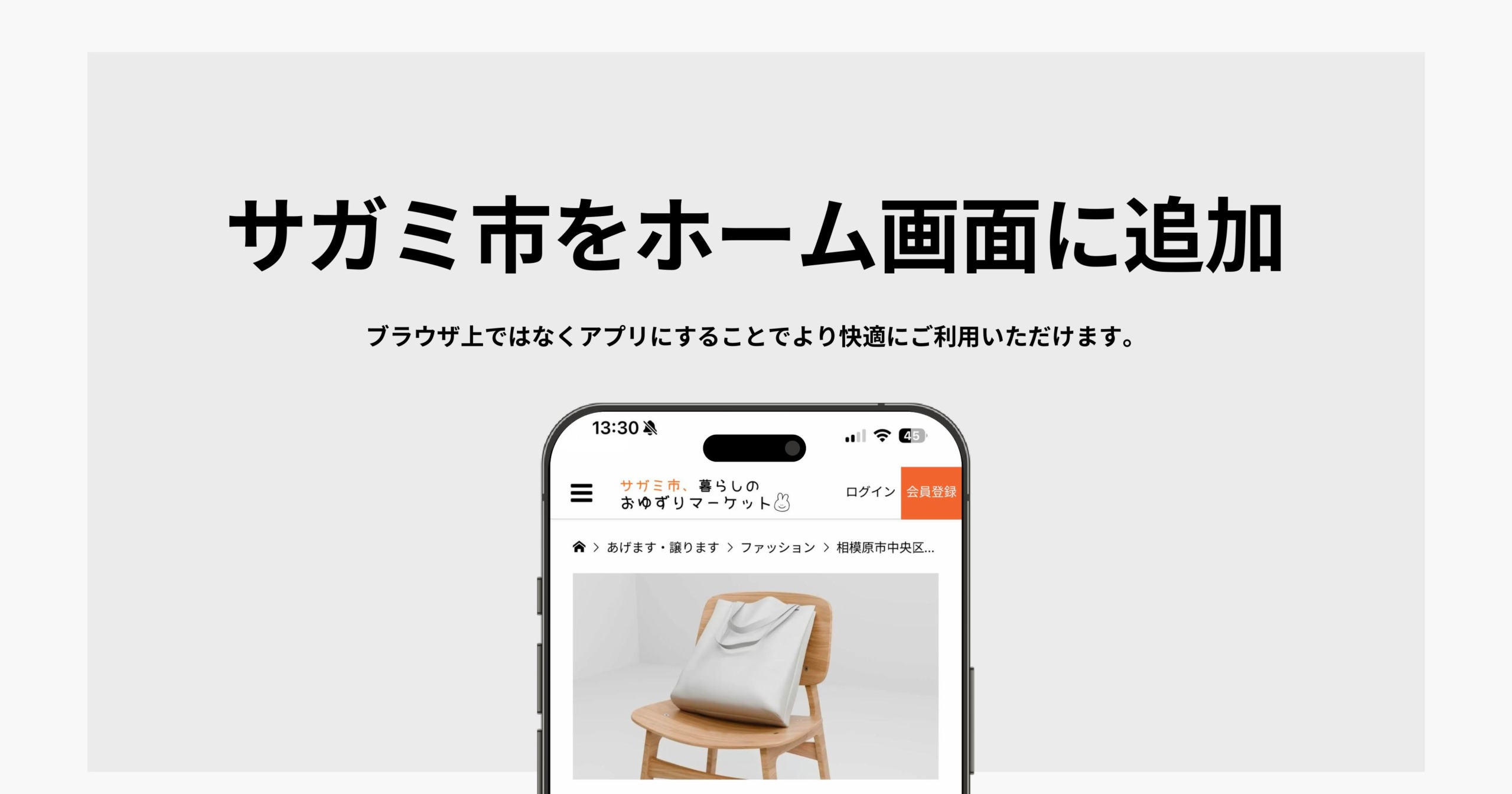 サガミ市は、iOS・Androidどちらでもホーム画面に追加するだけで、アプリ感覚で快適に利用できます。
